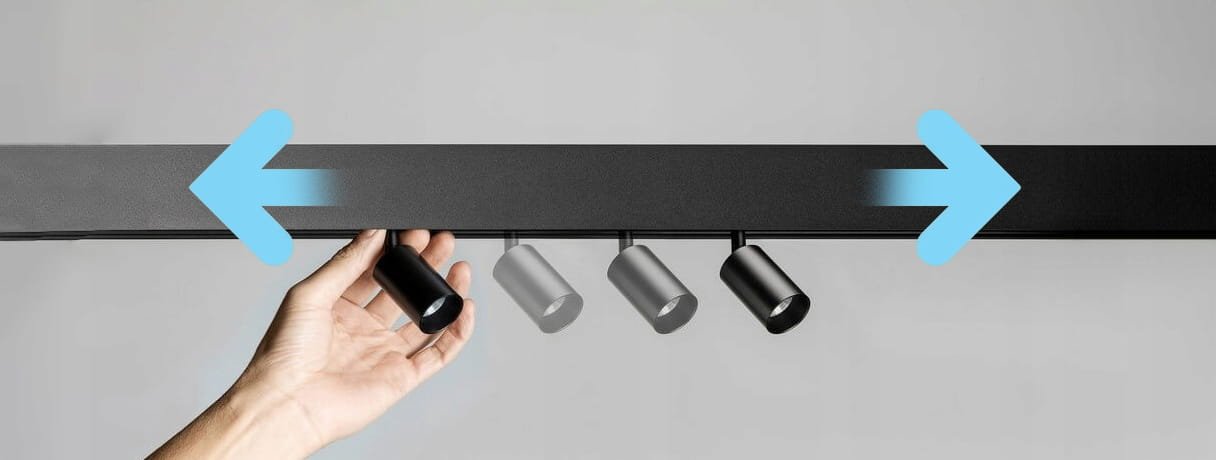 Tiesiog įstumkite šviestuvą į profilį. Modeliuokite šviesas taip kaip norite, nesunkiai galite pakeisti jų poziciją perstumdami ar perkeldami šveistuvus į norimą profilio vietą be jokių specialių įrankių.